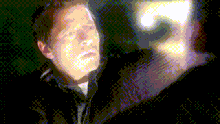 Emmanuel/Castiel then puts a hand on the Demon's head and the screams as white light streams from his face. Emmanuel/Castiel starts to get memories back to his time as Castiel in Chpt4 Ep1: Lazarus Rising, when he first made his presence to Hunter and Kurt. Emmanuel/Castiel smites two demons simultaneously with a hand to each of their faces. His flashbacks continue - of him helping Hunter in the past, then breaking the wall in Kurt's head and being handed a jar of blood by CROWLEY to open Purgatory.